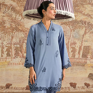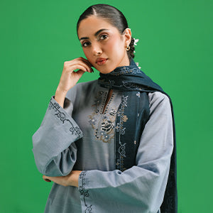 The Black Cotton Satin Luxury Embroidered 3PC Suit from the Eid Collection '25. Features an embroidered shirt with round neckline with a  slit & full-length sleeves paired with embroidered trousers & dupatta.