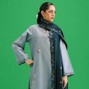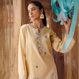 The Light Olive Floral Printed Co-Ord Set from our Legends of Fall '24 collection. An A-line shirt, band collar finished with buttons, quarter bell sleeves, lace embellishment on neckline, sleeves & hemline, paired with a shalwar.